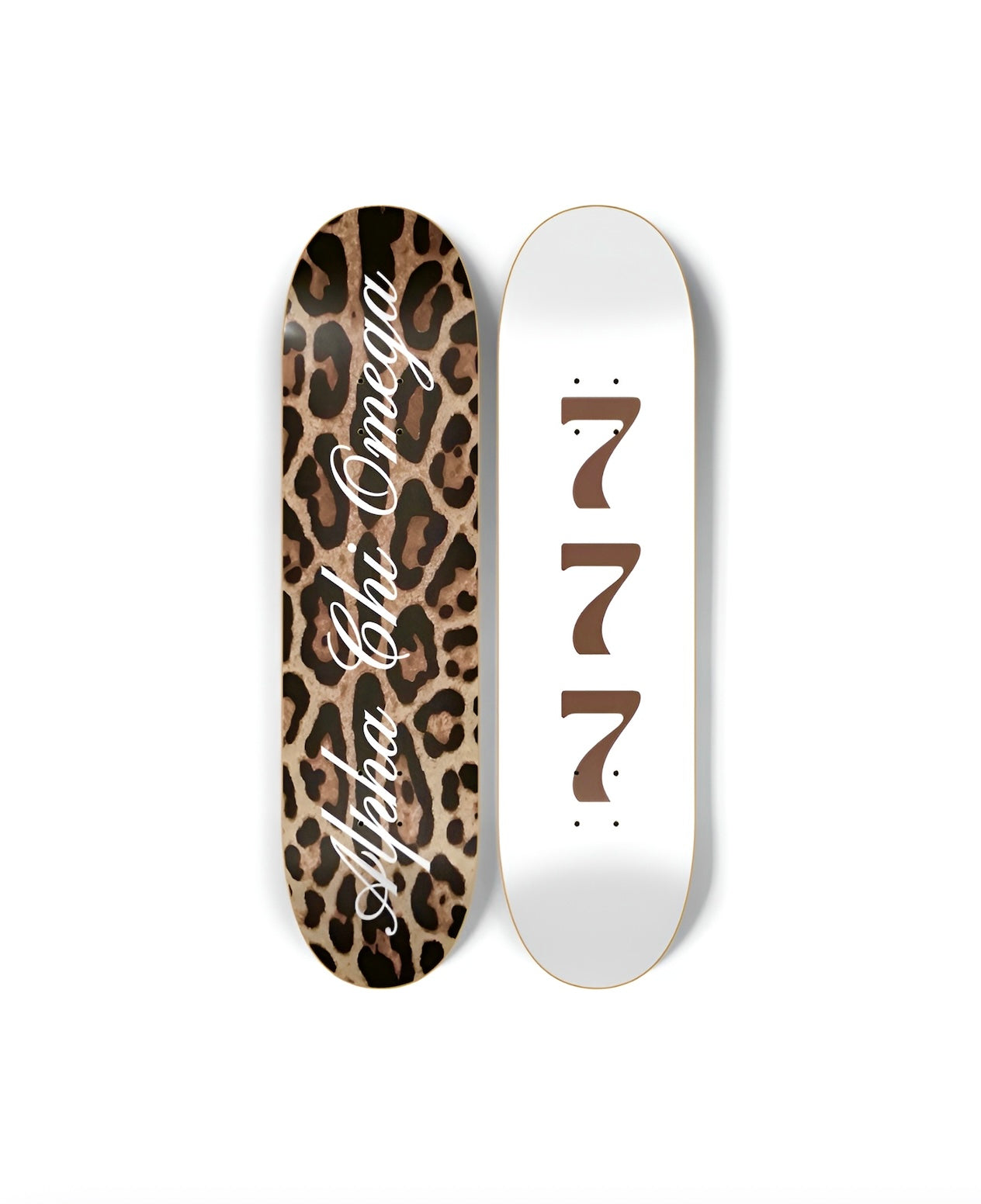 The cutest skateboard set of 2 featuring “Alpha Chi Omega” across one leopard board & lucky number 777 across the other board. Boards come more glossy than they appear.