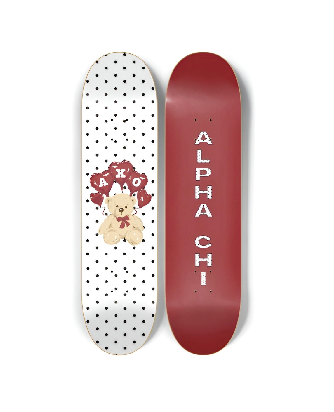 The cutest skateboard set of 2 featuring one board with “AXO” across three balloons with a teddy bear & another board in a gorgeous red color. Boards come more glossy than they appear.