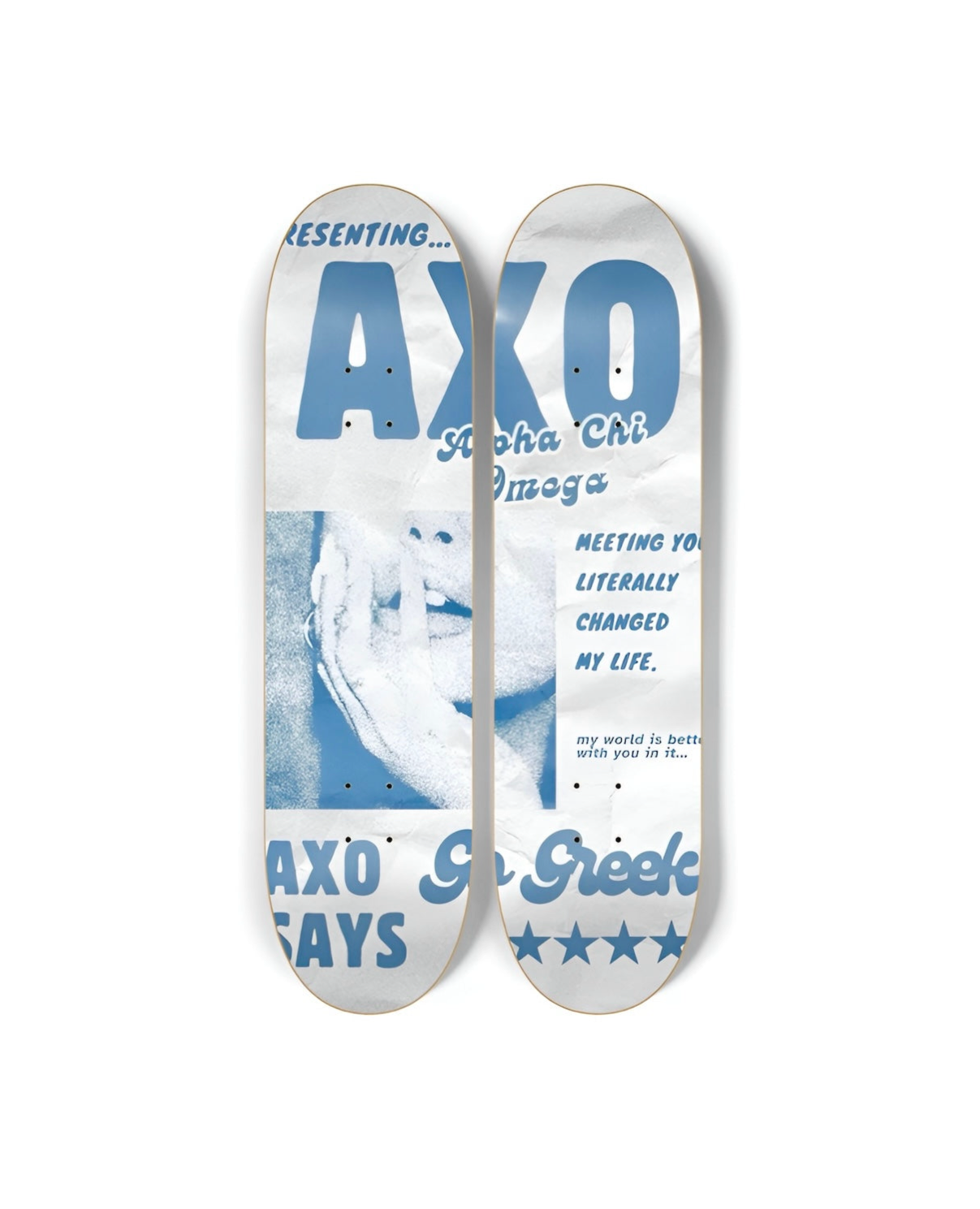 The cutest skateboard set of 2 featuring “AXO” across two boards in a pretty blue color. Boards come more glossy than they appear.