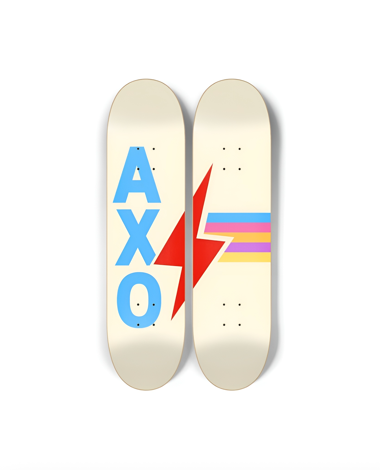 The cutest skateboard set of 2 featuring “Alpha Chi Omega” across two boards with a vibrant lightening bolt and rainbow as well. Boards come more glossy than they appear.