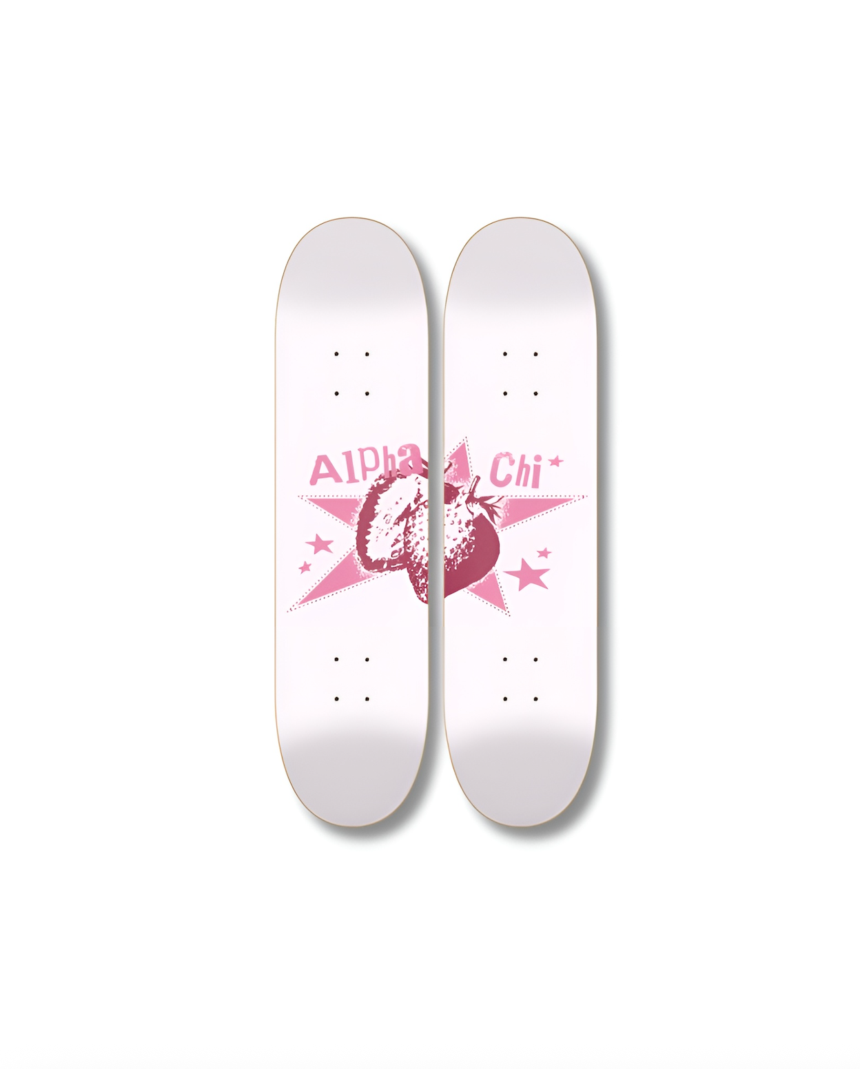 The cutest skateboard set of 2 featuring “Alpha Chi Omega” across two boards with pink strawberries and stars in various shades. Boards come more glossy than they appear.