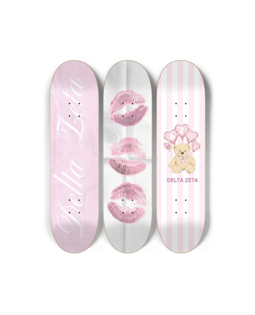 The cutest skateboard set of 3 featuring Delta Zeta, a teddy bear, and pink kisses. Boards come more glossy than they appear.