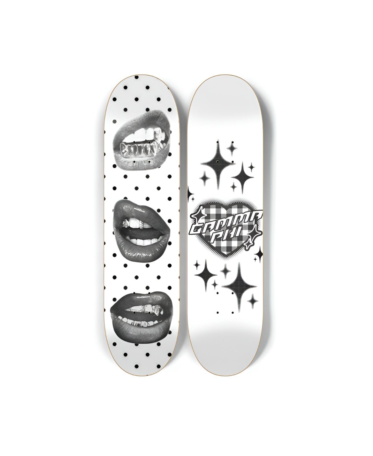 Two-board skateboard set featuring bold black-and-white lips on one board and retro “Gamma Phi” text with sparkles on the other. Boards come more glossy than they appear.