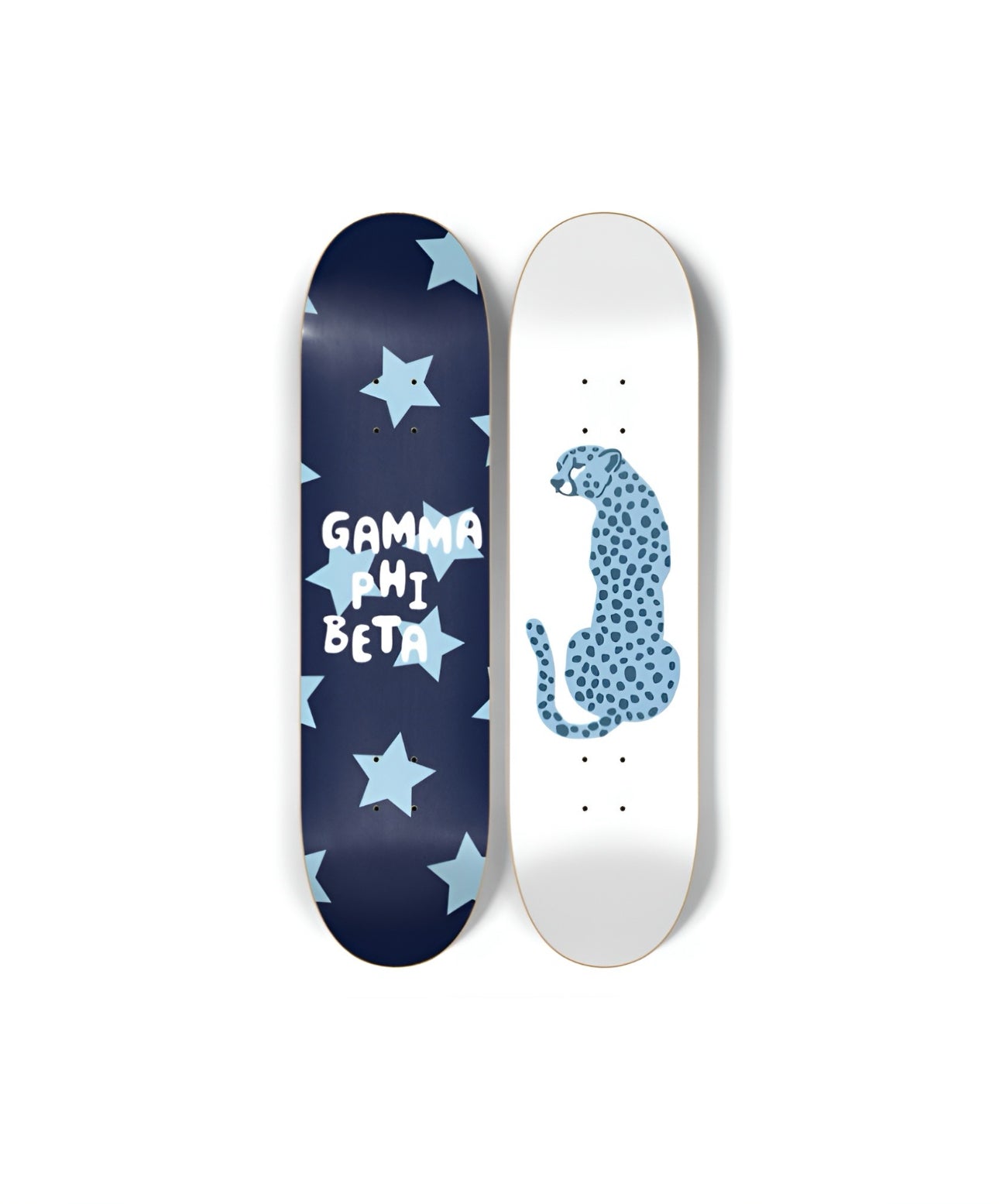 The cutest skateboard set of 2 featuring “Gamma Phi Beta" across one board on a beautiful blue background & a sky-colored leopard on the other board. Boards come more glossy than they appear.