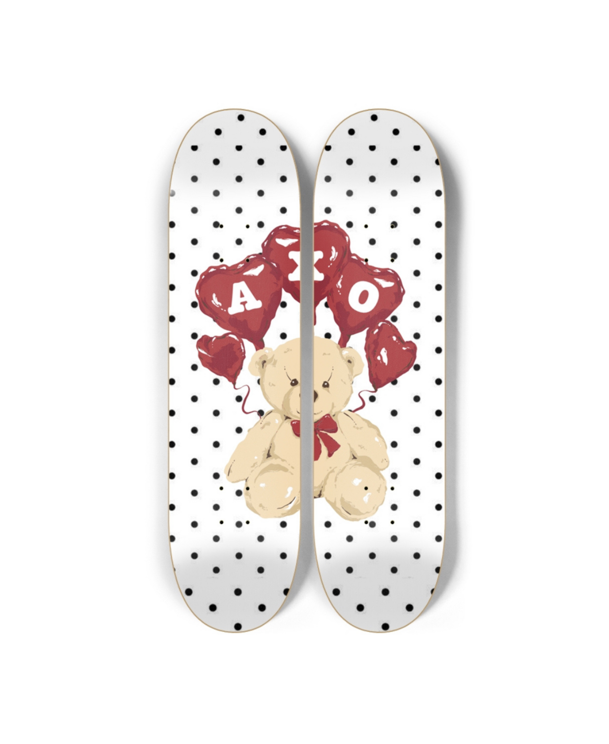 The cutest skateboard set of 2 featuring “AXO” across three balloons with a teddy bear. Boards come more glossy than they appear.