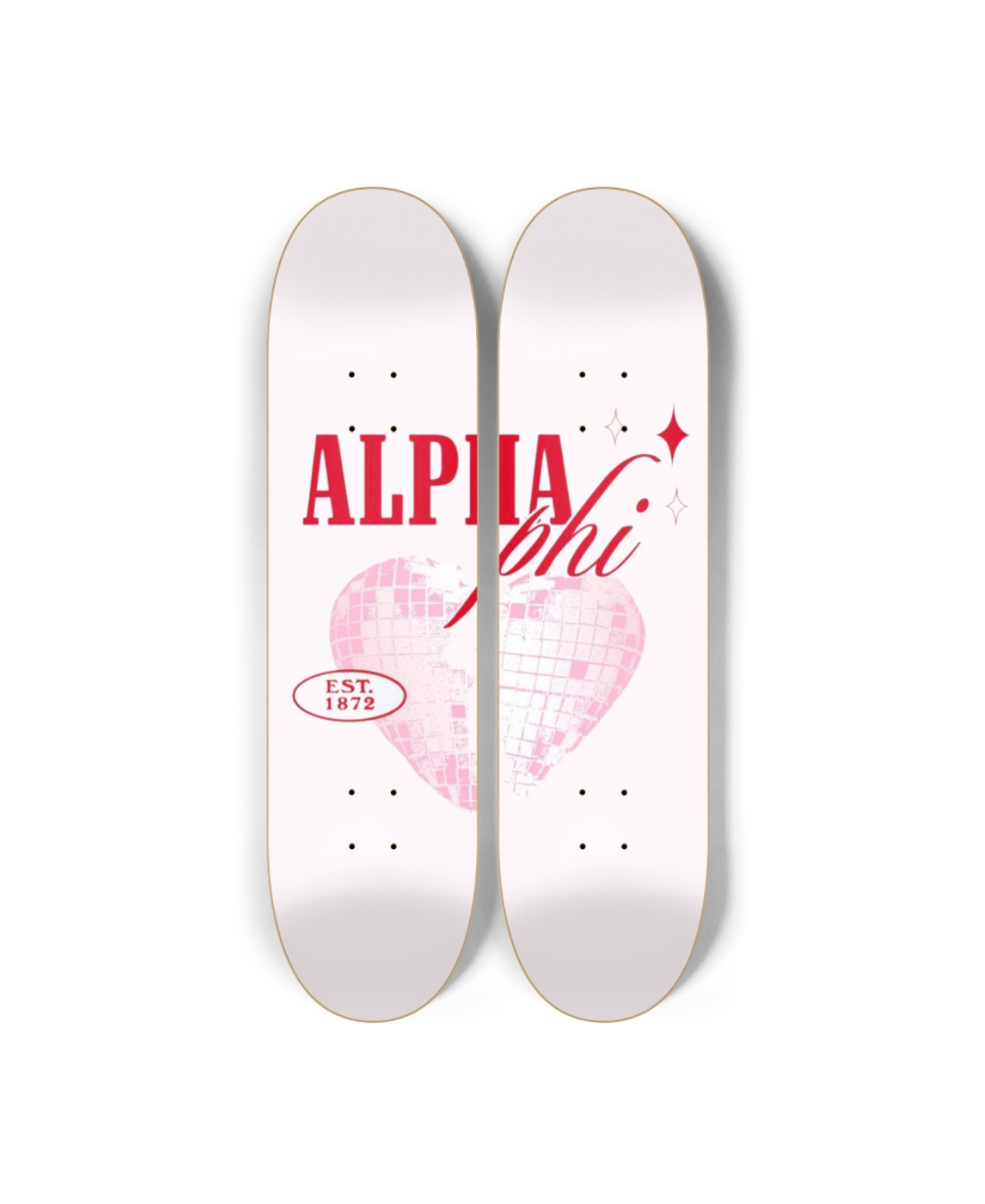 The cutest skateboard set of 2 featuring “Alpha Phi” across a pretty pink and red heart with sparkles! Boards come more glossy than they appear.